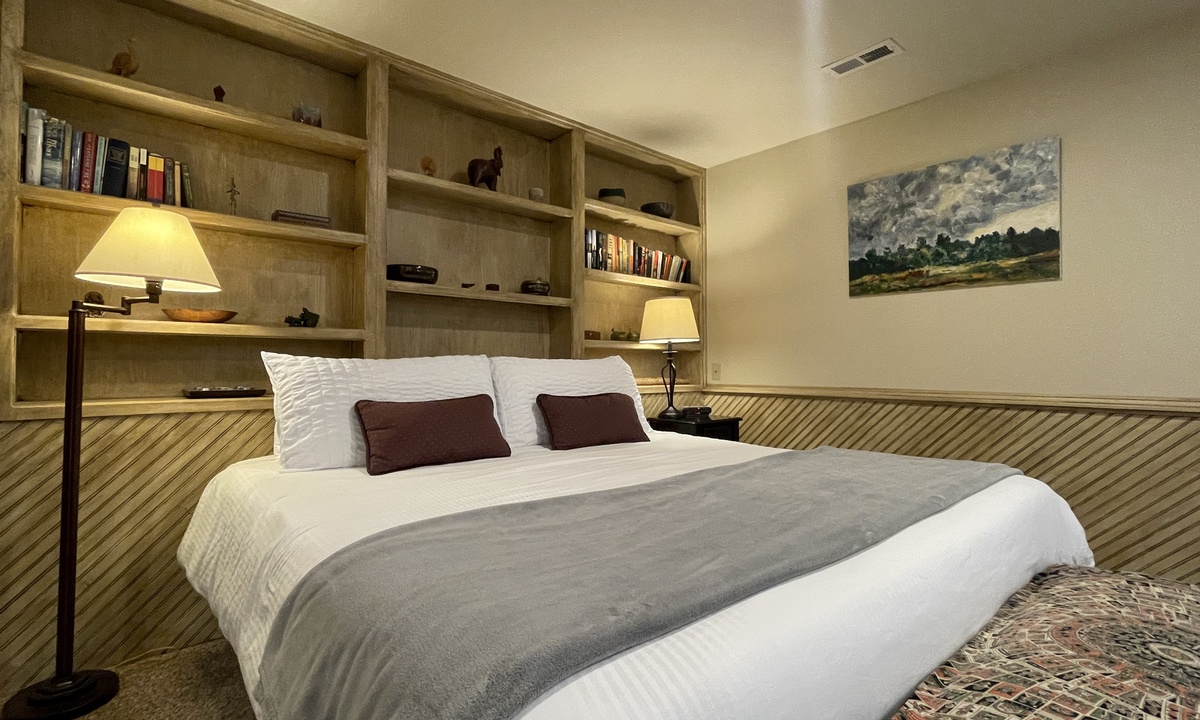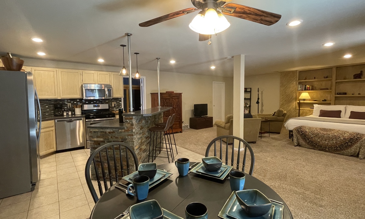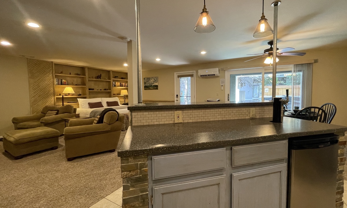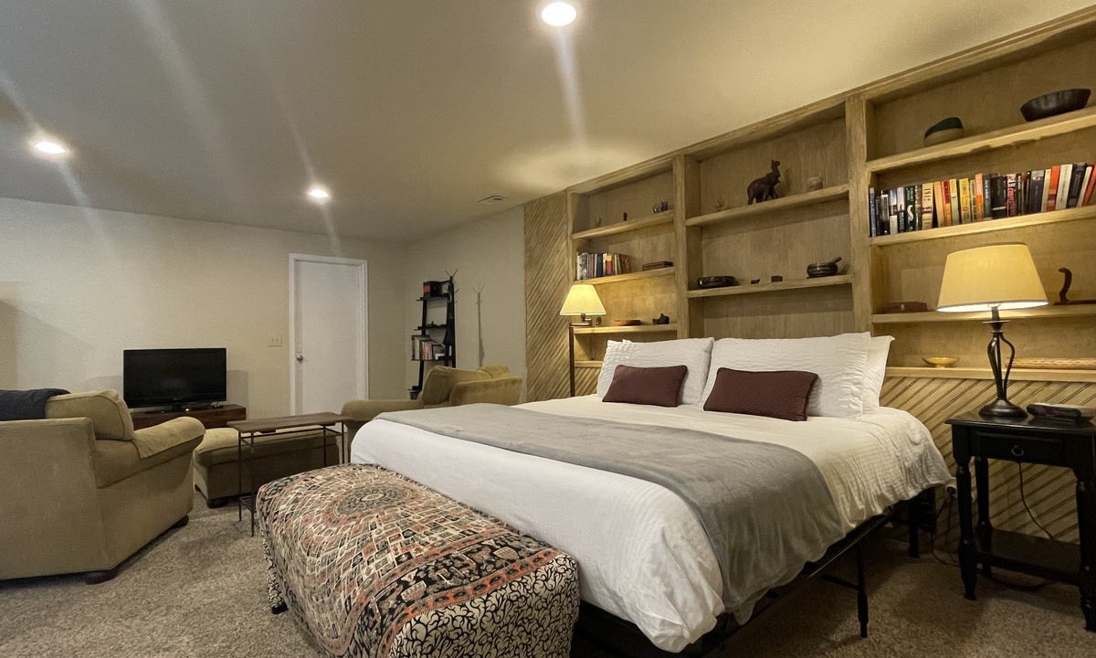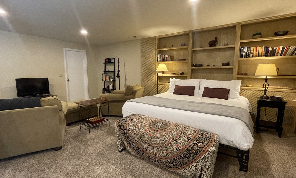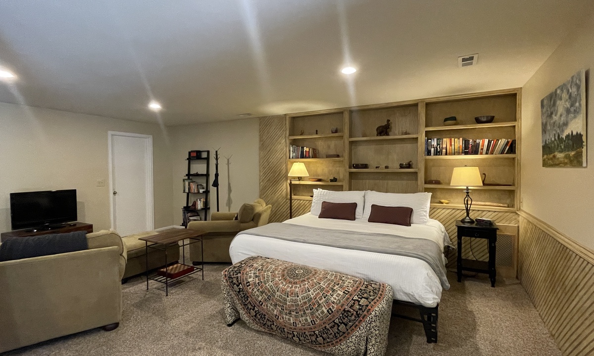 The perfect retreat for two, this private garden level apartment is nestled along the shore of Warren Lake and features a private hot tub, steam room with luxury shower panel and an infrared dry sauna with custom lighting and speakers. Interior highlights include a spacious living area with a full kitchen, cozy lounge/reading area and a plush California King Bed that guests rave about! It is centrally located in mid-town Fort Collins and perfect for a luxury couples retreat.