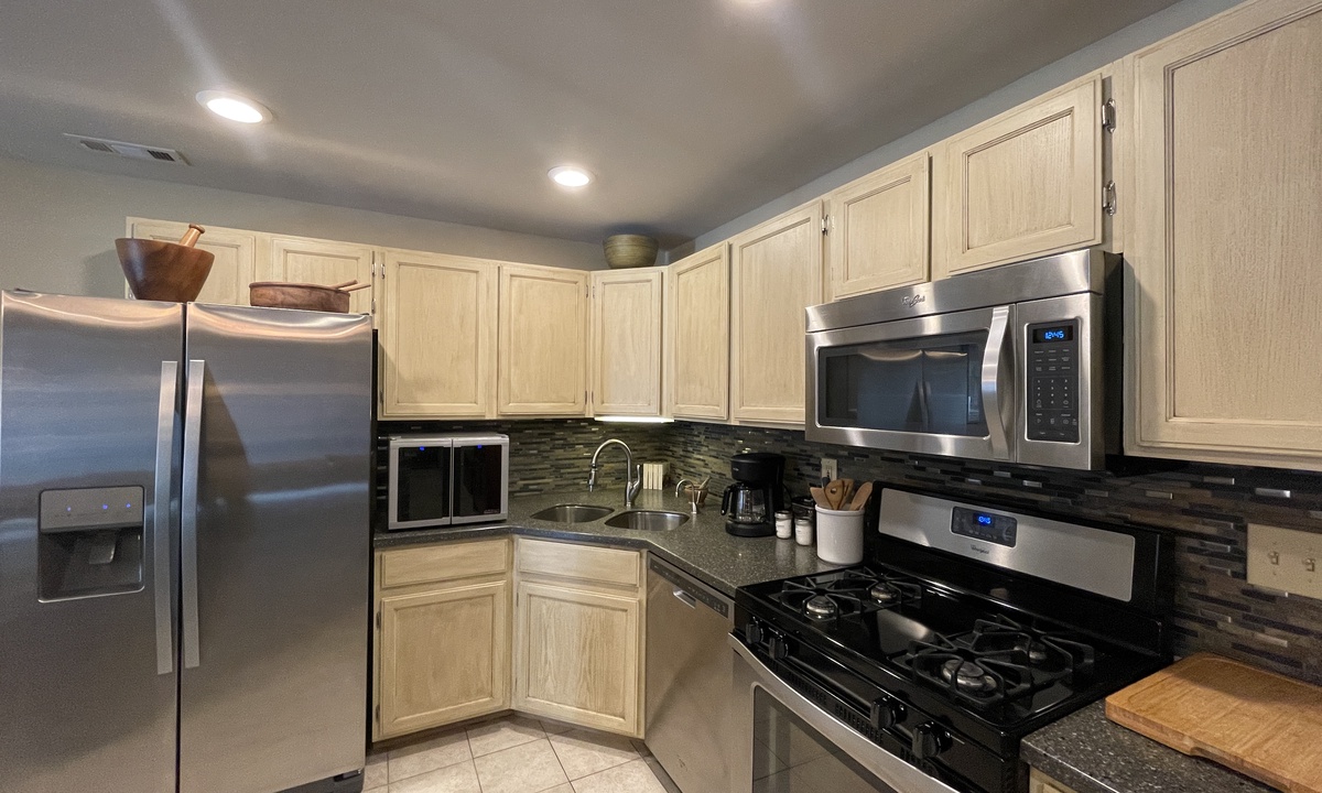 KITCHEN: Fully-equipped kitchen with stainless steel appliances including a dual zone wine fridge and an instant hot water tap; cooking basics, dishware/flatware (including good knives!), bar top with seating for 2; complimentary coffee, creamer, tea and sweetener
