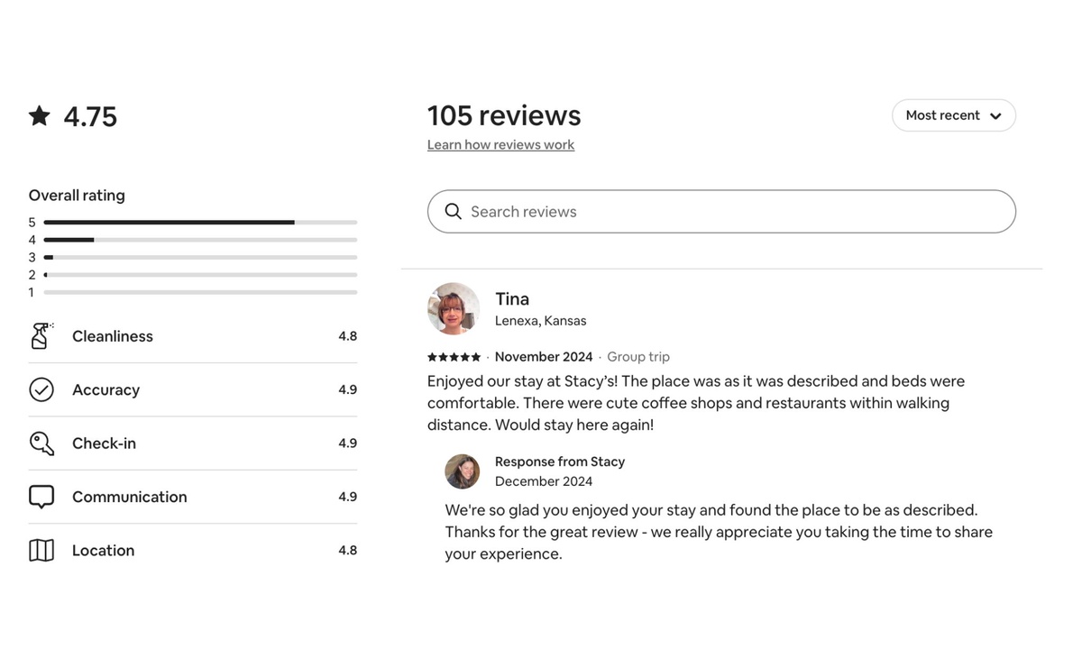 Enjoyed our stay at Stacy’s! The place was as it was described and beds were comfortable. There were cute coffee shops and restaurants within walking distance. Would stay here again!