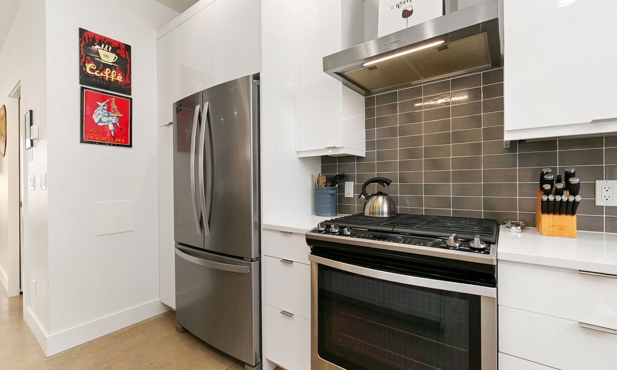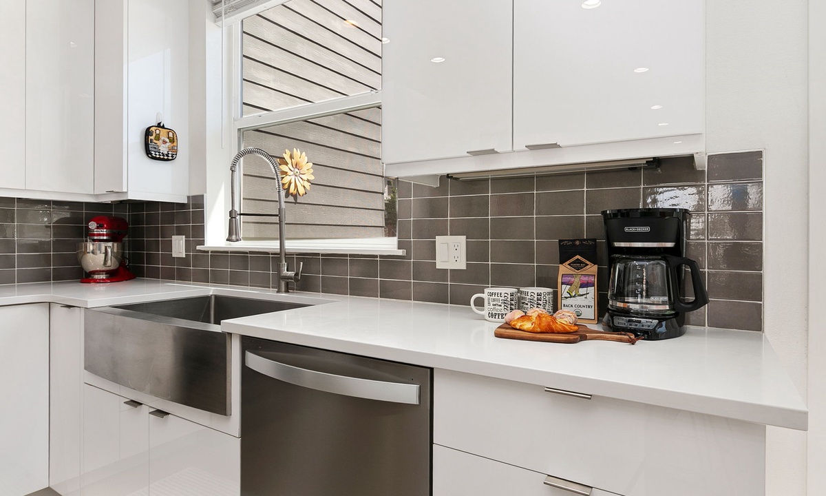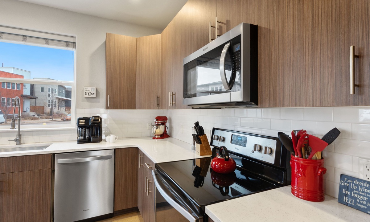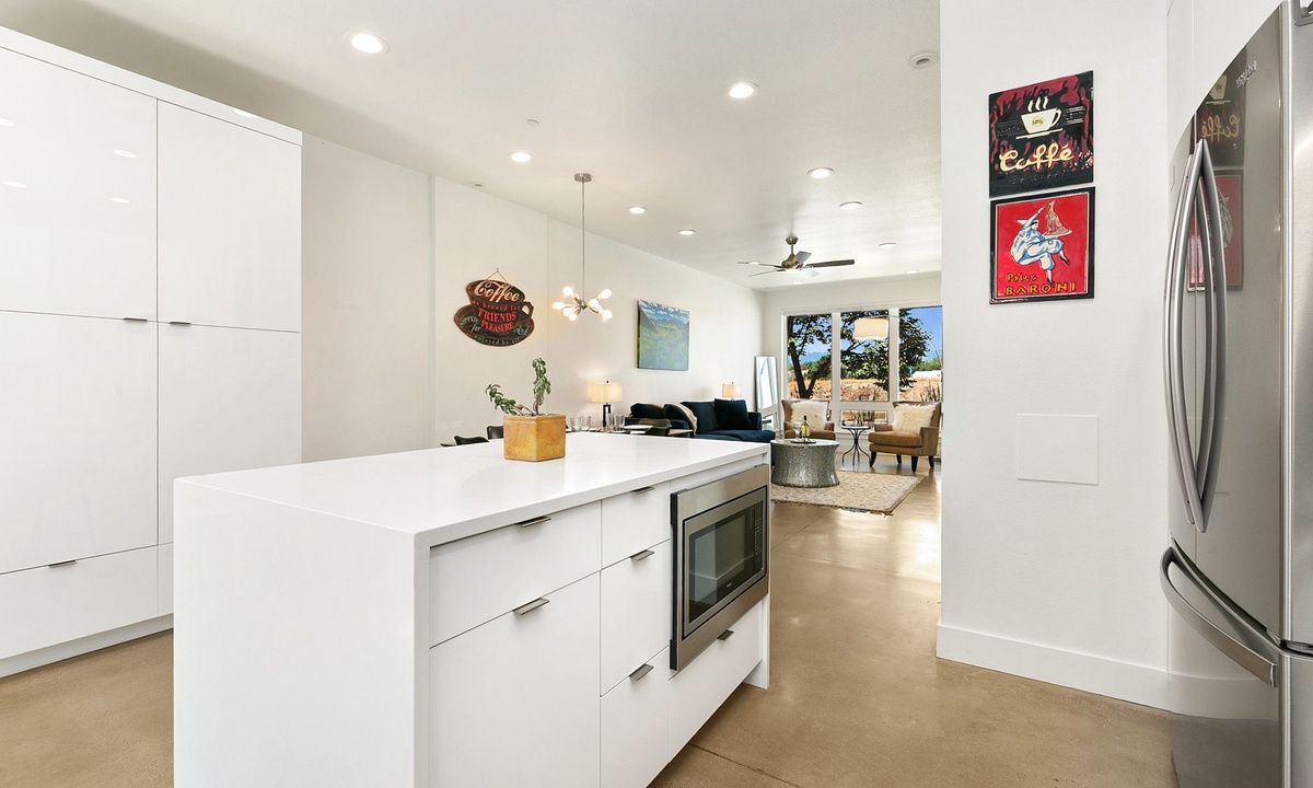 KITCHEN: Two fully-equipped chef’s kitchens with stainless steel appliances, microwave, cooking basics, dishware/flatware, spices, kitchen island, complimentary coffee, creamer, tea and sweetener