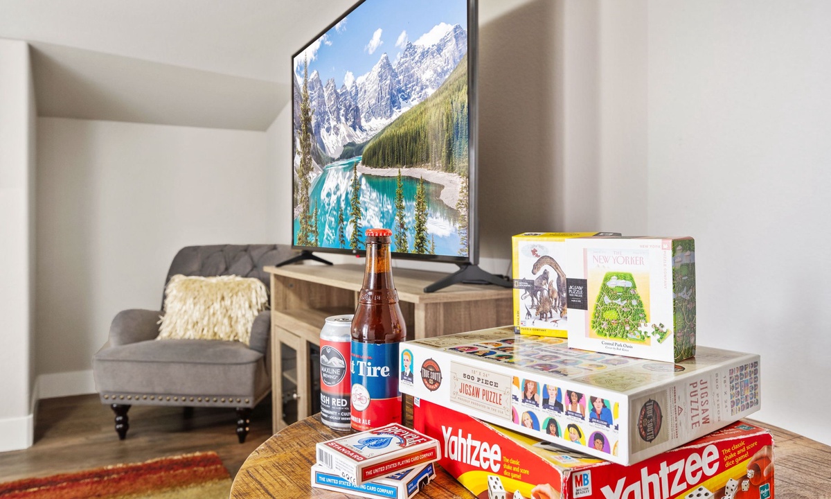 INDOOR LIVING: Multiple 75" flat-screen TVs, dining tables, board games, ceiling fans, fireplace, laptop-friendly workspace
