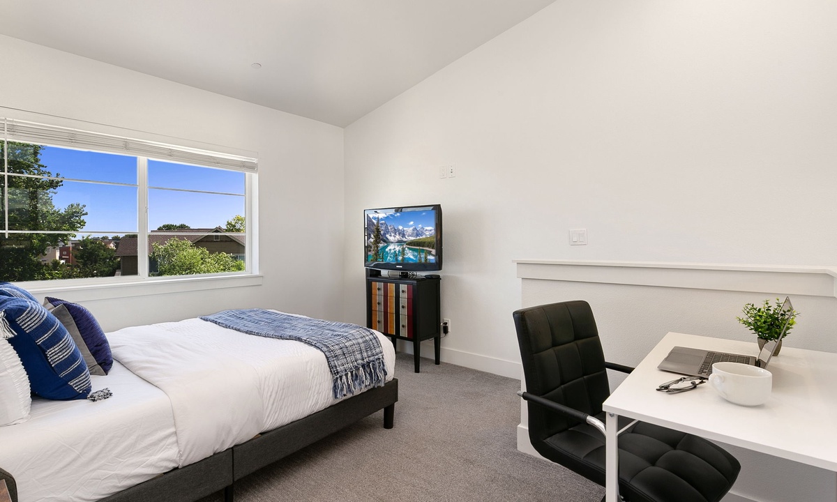 Bedroom 5: Queen Bed (main level) | Bedroom 6: King Bed with Ensuite Bathroom (second level) | Bedroom 7: King Bed with Ensuite Bathroom (second level) | Bedroom 8: Queen-sized Sleeper Sofa and 75” Flatscreen TV (third level) | Plus Queen Air Mattress