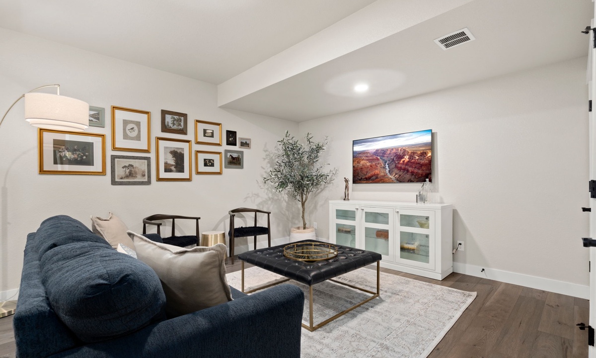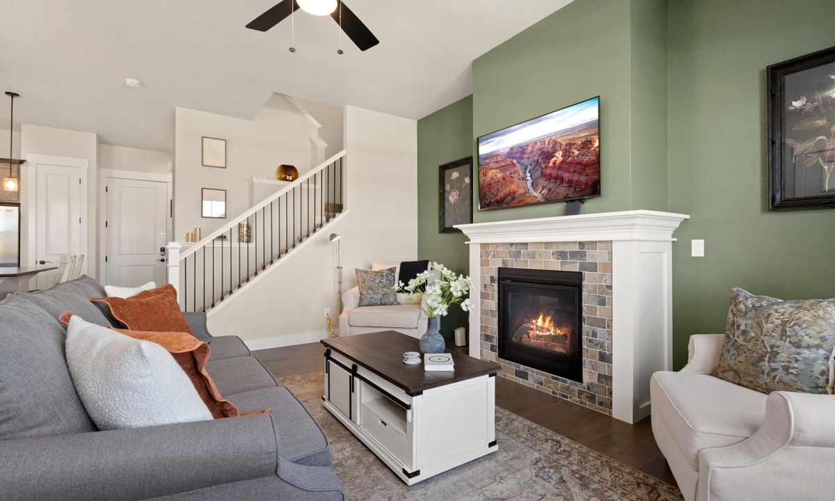 INDOOR LIVING: Multiple Smart TVs, dining table with seating for 6, board games, ceiling fans, indoor fireplace, laptop-friendly workspace, dart board, multiple living areas